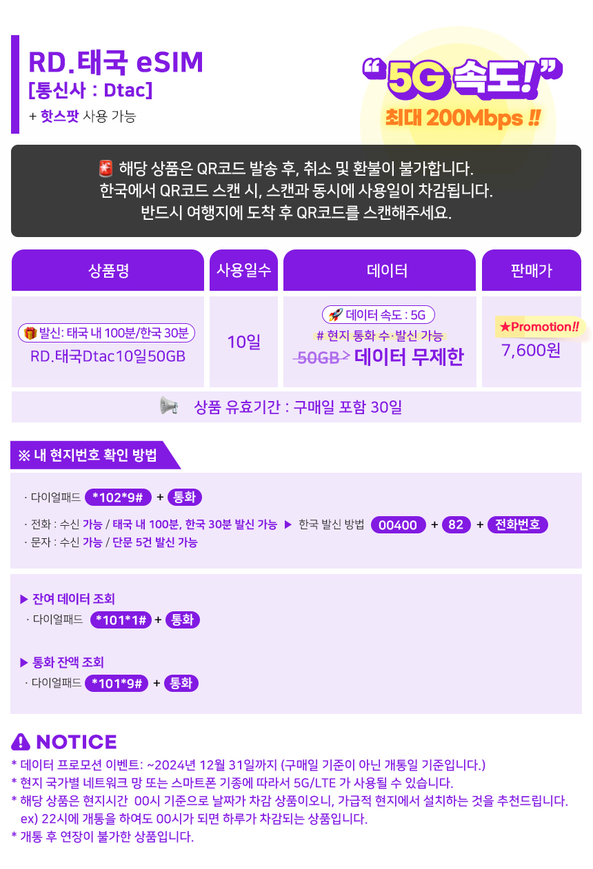 태국이심 eSIM 5G Dtac 7일15GB 소개